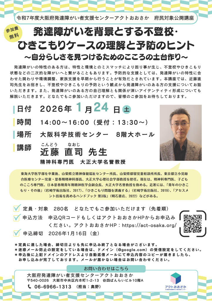 発達障がいの特性のある方は、特性と環境とのミスマッチにより困り事が生じ、不登校やひきこもり状態などの二次的な障がいへと繋がることもあります。予防的な支援としては、発達障がいの特性に合わせた関わりや環境調整、家族支援を早期から行うことが有効だとされています。本講座では、近藤直司先生をお招きし、不登校やひきこもりの予防という観点から発達障がいのある方の支援についてお話いただきます。また、発達障がいのある方の自己理解とも関係が深いアイデンティティ形成についても解説いただきます。どなたでもご参加いただけますので、皆様のご参加をお待ちしております。